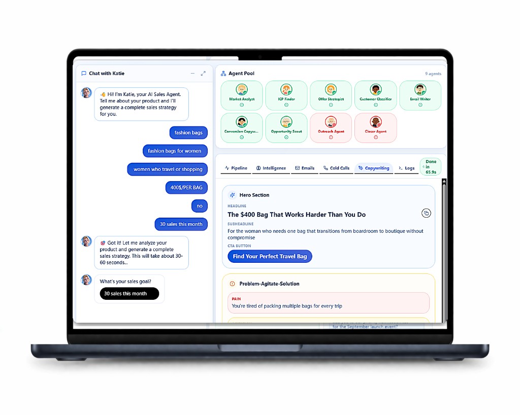 Katie is a specialized AI agent trained to think like your best SDR. Give her your product, your target market, and your goals — she'll build the full sales system you need to close deals, fast.